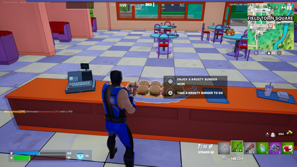 Одна из самых крутых вещей в локации Krusty Burger в Fortnite — это огромное подношение бургеров, которое можно найти на прилавке. Многие игроки считают это лучшим дополнением к Fortnite в недавнем обновлении. Когда вы съедаете один, он медленно восстанавливает 10 здоровья и 30 вашего щита.