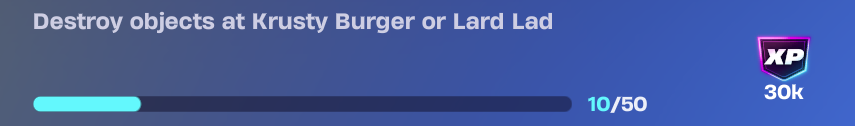 В этом сезоне одно из заданий просит вас ломать вещи в Krusty Burger. Просто отправляйтесь туда и уничтожайте всё, что сможете, киркой или стреляя по объектам. Разрушение 50 предметов даст вам 30 000 XP, что поможет вам повысить уровень вашего Battle Pass.