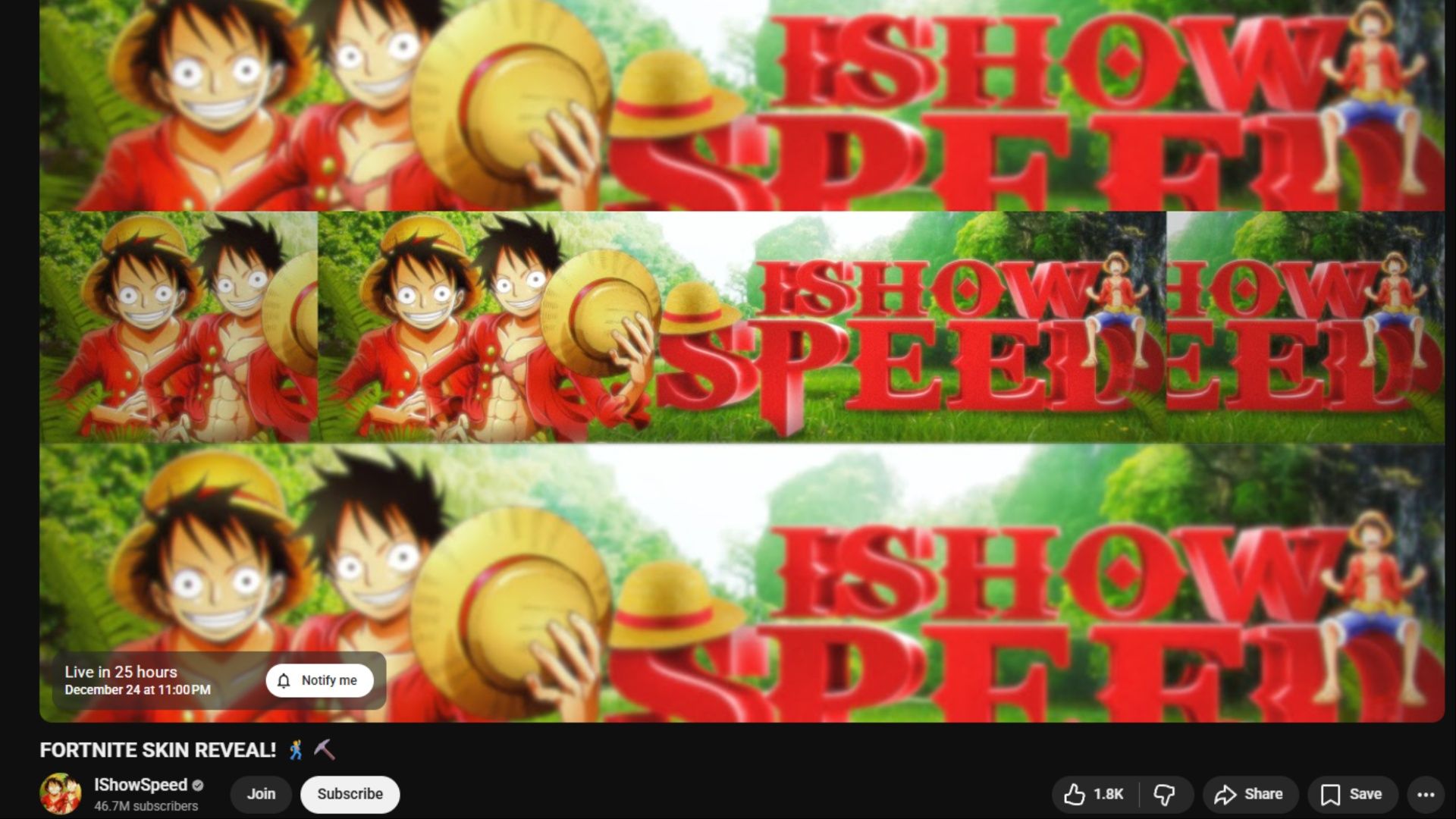 Трансляция, демонстрирующая новый скин Fortnite, уже доступна на YouTube-канале IShowSpeed, хотя она и не начнётся до 18:00. Вы можете посмотреть её сейчас, но она не будет в прямом эфире до этого времени.