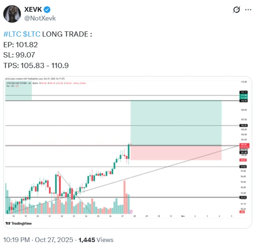 ETF спотового Litecoin, зарегистрированный в США, от Canary Capital обрушился 28 октября, словно сюрприз на день рождения для инвесторов. LTC немедленно получил уверенный импульс в 3.5%, потому что ничто так не говорит «Я здесь навсегда», как регуляторное одобрение. Теперь традиционные финансы шепчут: «Возможно, криптовалюта — это не только для ребят в футболках с Doge.» 🎓🎩