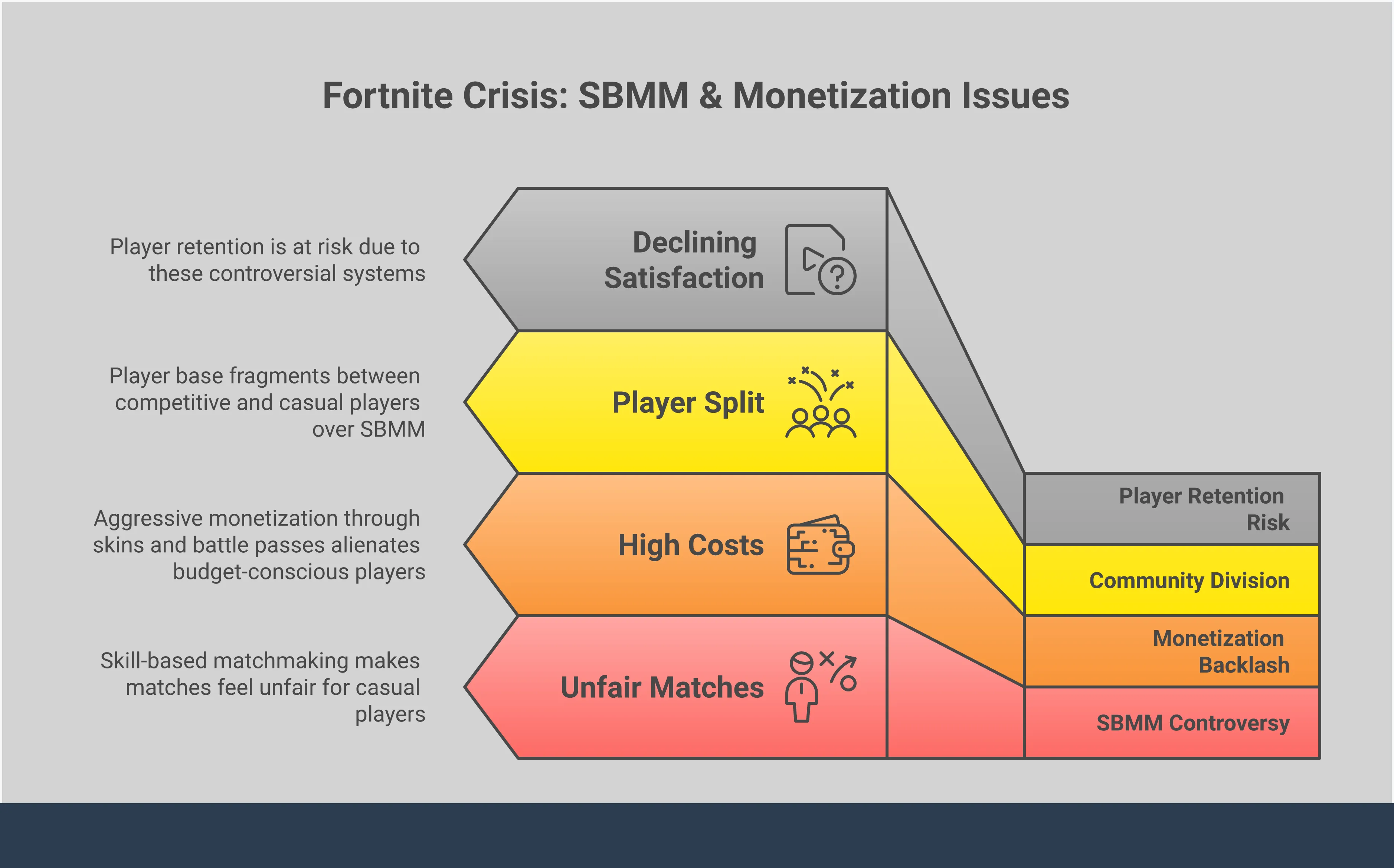 Игроки последовательно выражали обеспокоенность, особенно в отношении того, как игра подбирает игроков с похожим уровнем мастерства. Однако не ощущается, что их отзывы принимаются во внимание. Epic Games, похоже, пытается удовлетворить как соревновательных, так и казуальных игроков, но в конечном итоге не удается угодить ни одной из этих групп. Один из игроков отметил, что последние обновления демонстрируют нерешительность Epic в отношении того, какой аудитории уделить приоритет, и они не могут успешно удовлетворить потребности никого. Часто кажется, что то, чего хочет сообщество, менее важно, чем внутренние данные – если функция приносит доход, она остается в игре, даже если игроки категорически ее не любят. Это оставляет сообщество с ощущением игнорирования и разочарования, поскольку их опасения, похоже, не влияют на направление развития игры.